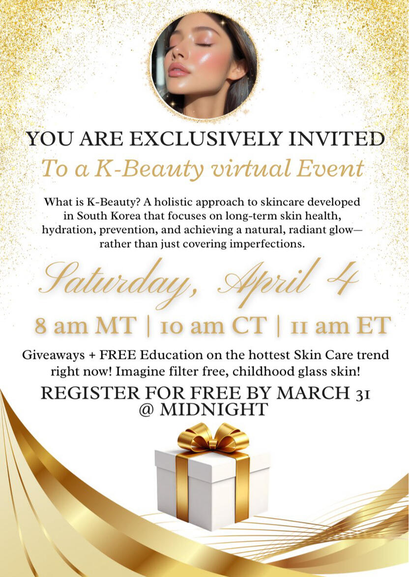 Hey, Name! This is (Your Name), I’m so excited because my mentors & I are hosting a K-Beauty event on Saturday, April 4 and I hand selected you as my guest!We are giving away 💸 brushes 🛍, an acrylic shelf + TONS of product 🧴It’s designed to give tips on the trending K-Beauty (Korean Beauty) skin care routine and uplift women and it’s going to be huge + it’s FREE!Should I send you the link?! ✨send this message with the event graphic
